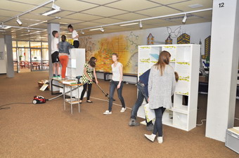 Zwei Teams machen sich daran in der Pausenhalle die Regale aufzubauen, zwei Teams schleifen draußen die Kanten der Spanplatten und schneiden mit der Stichsäge Holzklötzchen. Zwei weitere Teams fangen an die LED-Leisten zu bauen und spielen die Filme auf die drei Tablet-PCs. Zum ersten Schichtwechsel um 11:30 Uhr kann man schon erkennen, dass es eine Ausstellung werden soll. Die zweite Schicht foliert die 40 Spanplatten mit den Ausstellungstexten, klebt die Holzklötzchen in die Ecken jedes Fachs, und bereitet die Plexiglasplatten für die Vitrinen vor.