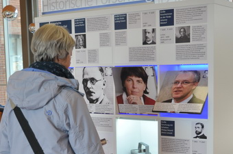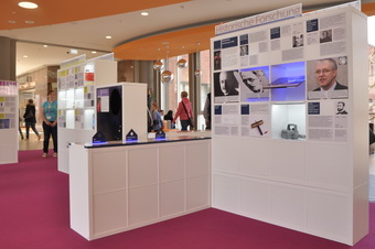 Um die Ausstellungen für Besucherinnen und Besucher noch attraktiver zu machen, sind wir dabei verschiedene einfache Module zu entwickeln, die dazu anregen sollen die Ausstellung nicht nur zu lesen, sondern tatsächlich aktiv mit ihr zu interagieren. Für die Ausstellung zur Materialforschung in Kiel haben wir drehbare Tafeln konzipiert, um historische Forscher aktuellen Wissenschaftlerinnen und Wissenschaftlern gegenüberzustellen.