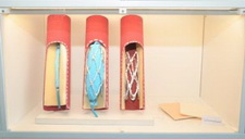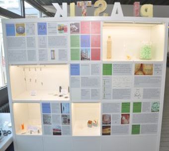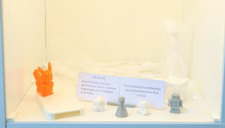 Eines der Modelle zeigt in starker Vergrößerung das einbringen eines (Kunststoff-)Stents in ein Blutgefäß, weitere Vitrinen zeigen selbst hergestellte Biokunststoffe aus Milchsäure, recyclebare Styroporchips und eigens für die Ausstellung gedruckte 3D-Figuren.