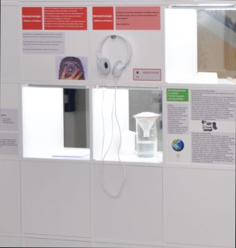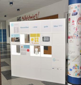 Des Weiteren informierten die Schülerinnen und Schüler die Besucher über alltägliche Produkte, die aktuell Nanosilber enthalten und deren Anwendung. Um dabei die gesellschaftliche Problemstellung deutlicher darstellen zu können, haben die Schülerinnen und Schüler ein fiktives Gespräch geschrieben: Ein Wissenschaftler, ein Reporter und eine Schülerin diskutieren die Chancen und Risiken des Einsatzes von Nanosilberprodukten im Krankenhaus. Das Gespräch wurde aufgenommen und kann von den Besuchern in der Ausstellung angehört werden.