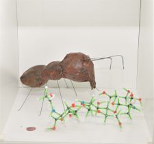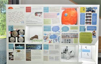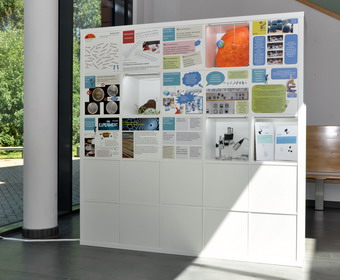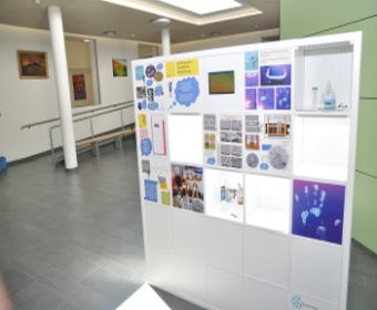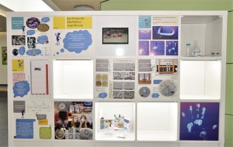 Wie können diese tollen Ergebnisse anderen Schülerinnen und Schüler sowie deren Eltern zugänglich gemacht werden? Hierfür bauten die Schülerinnen und Schüler mit Hilfe von Herrn Dr. Lorenz Kampschulte (IPN) und seinen Mitarbeitern Maria Weisermann, Bianca Blank und Karsten Eilert, ein Ausstellungsregal auf, auf dem die wesentlichen Ergebnisse zur desinfizierenden Wirkung von Silbernanopartikeln in Form von Text, Bildern und Modellen, zum Nachlesen und zur Ansicht der Schule und deren Besuchern zur Verfügung stehen. Mit sichtlicher Freude waren alle am Aufbau der Ausstellung beteiligt, spiegelt sie doch in ihrer Wertigkeit die hohe Wertschätzung der vorliegenden Schülerarbeiten wider.