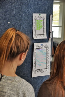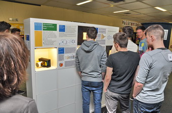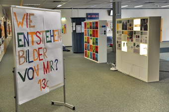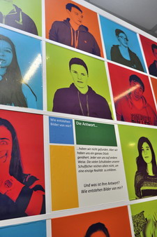 One hour after the opening, the first stress test for the exhibition begins: Two 9th grades classes are visiting the exhibition with their teacher in order to engage in more detail with the subject “Pictures of me”. After the introduction, the two classes are pouring in the exhibition. The tension rises. Are the texts comprehensible for the pupils? How stable are the hands-on demonstrations? Are there any questions concerning the topics? Yes. Yes. And yes, but this is good! Baptism of fire passed.