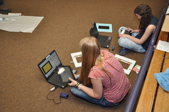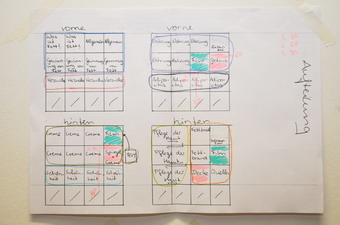 In the break hall, two teams are beginning to build up the shelves, during two other teams are grinding the corners of the flake boards and are cutting wood bricks. Two other teams are building the LED-Strips and they are uploading the films on the three tablet-pc. At 11:30, the first change of shift it is possible to see that the result will be an exhibition. The second shift is covering the 40 flake board panels with the text foils; it is gluing the wooden bricks into each corner of each box, and prepares the Plexiglas plates for the showcase.